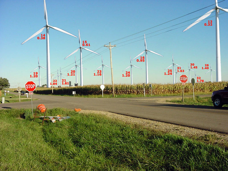 View from Kentville Rd & Wyanet Walnut Blacktop intersection looking southeast. Numbers indicate turbine # & distance in miles.