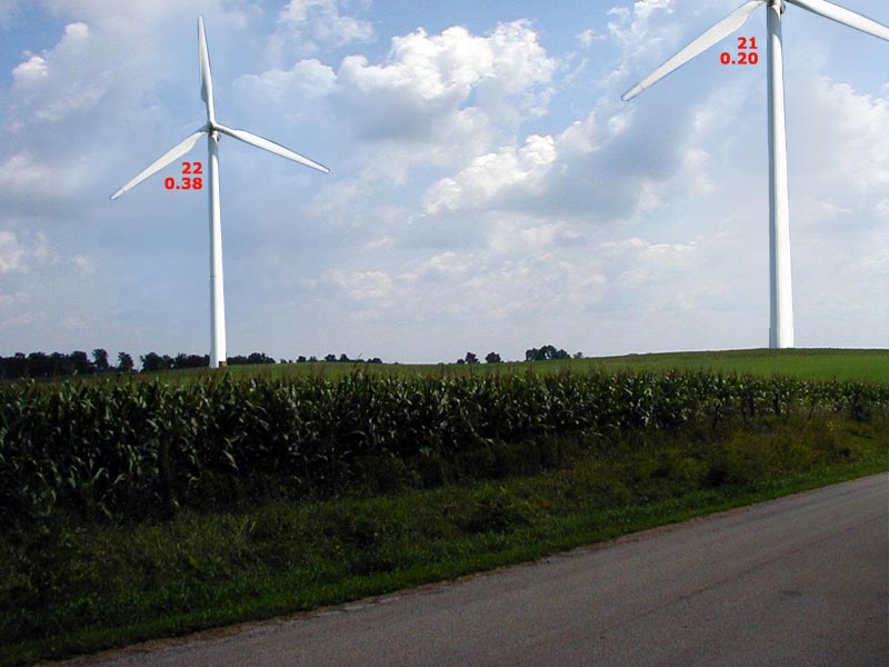 View from 1550 East St facing southeast. Numbers indicate turbine # and distance in miles.