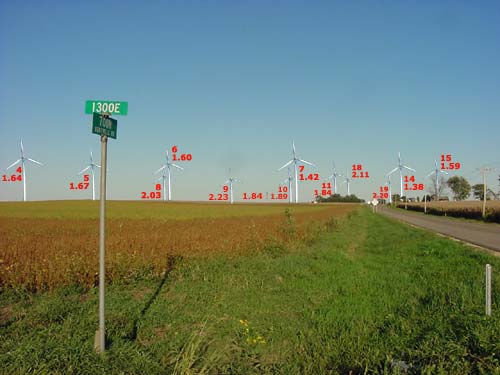 View from Kentville road looking east from 1300 E Road, 1 mile from project. Numbers indicate turbine # and distance in miles. View 800x600 hi-resolution photos here.
