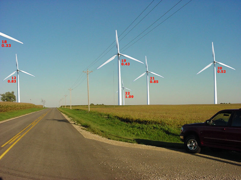 View from 1475 E Rd looking east down Kentville Road. Numbers indicate turbine # and distance in miles.