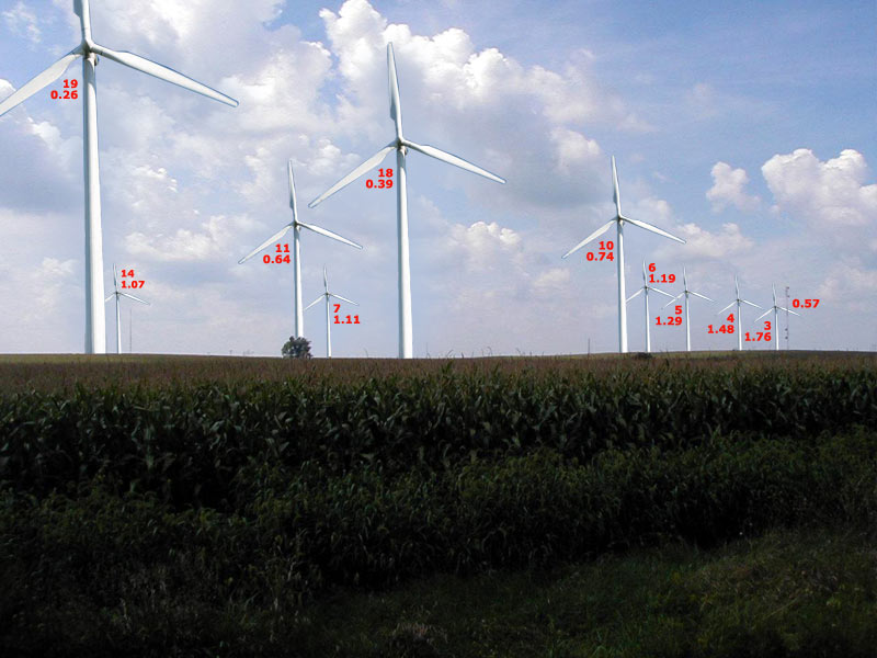 View from 1550 East St facing west. Numbers indicate turbine # and distance in miles.
