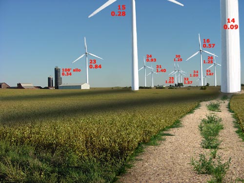 View from Kentville road between Wyanet Walnut Blacktop and 1475E Road looking south-southeast. Numbers indicate turbine # and distance in miles. View 800x600 hi-resolution photos here.