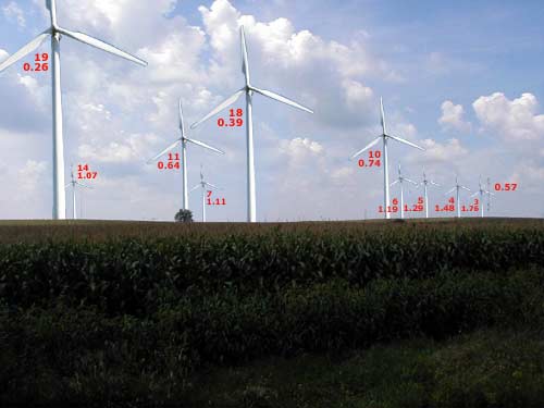 View from 1550 East St. facing west. Numbers indicate turbine # and distance in miles. View 800x600 hi-resolution photos here.